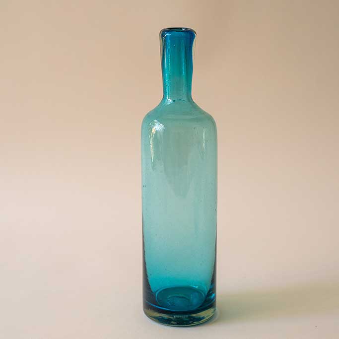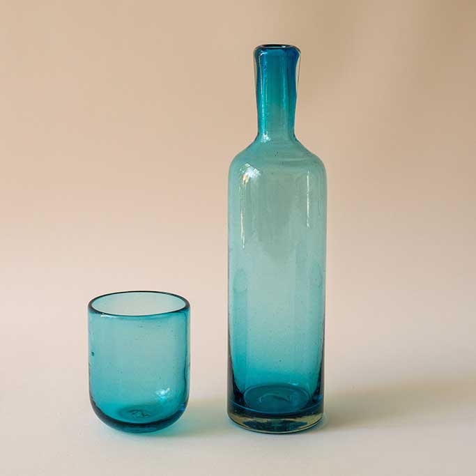 Set of hand-blown glass bottle and glass, ideal for serving water or other cold beverages. Each piece is unique, with slight variations that reflect the handcrafted nature of the glass.