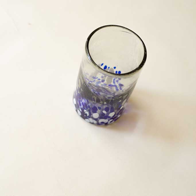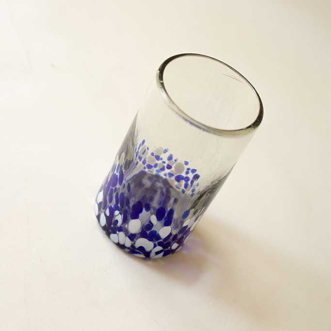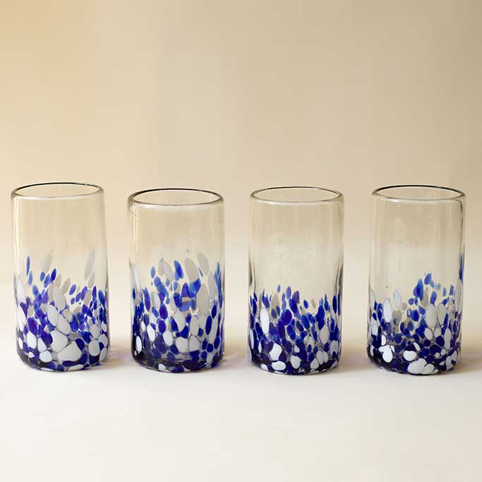 A handcrafted tumbler featuring a dynamic cobalt and white speckled finish within a clean 8×15 silhouette. Each piece is individually made, resulting in subtle variations that highlight its artisanal character. Its tall, balanced form makes it ideal for serving refreshing beverages with a distinctive and expressive touch.