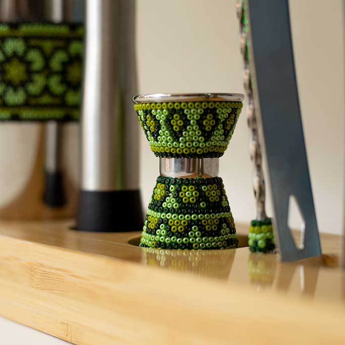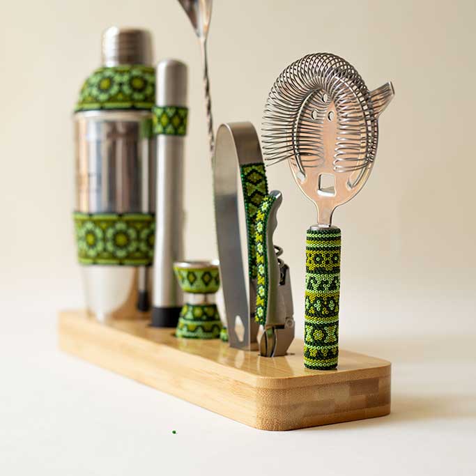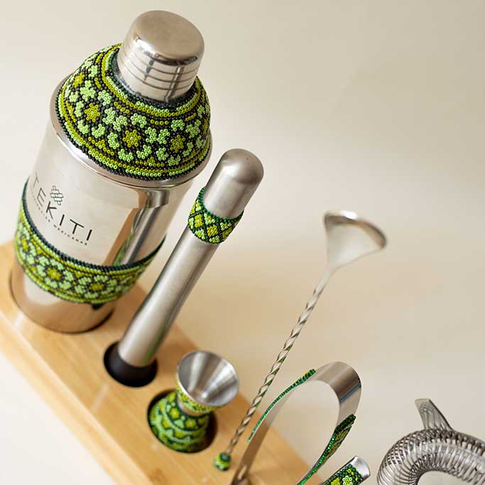 A complete mixology set decorated by hand using the Wixárika beadwork technique. Each piece is individually adorned by artisans, resulting in unique compositions rich in color and cultural meaning. The set combines functionality with intricate detail, elevating the cocktail-making experience with a distinctive character.