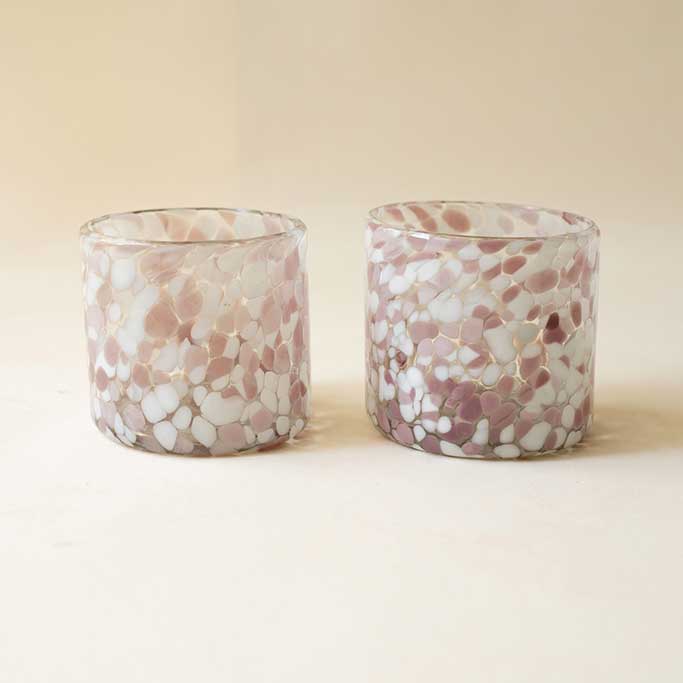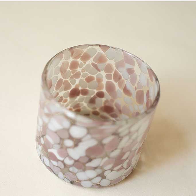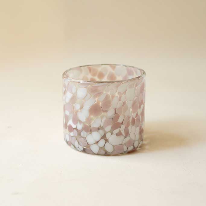 A handcrafted old fashioned glass featuring a soft blend of pink and white tones within a clean 8×8 silhouette. Each piece is individually made, resulting in subtle variations that highlight its artisanal character. Its solid feel and balanced proportions make it ideal for classic cocktails or an elevated everyday table setting.