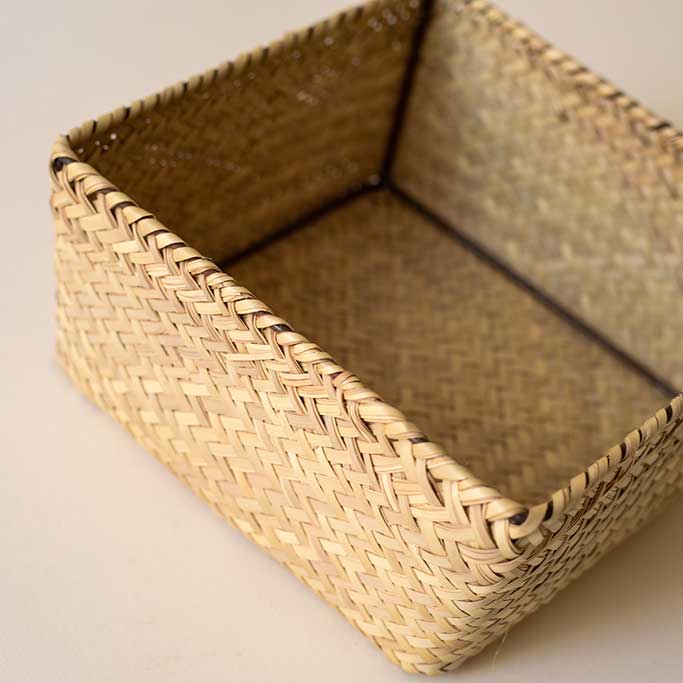 Square basket made from woven palm from the Mixteca region, ideal for organizing, serving, or decorating, adding a natural, handcrafted touch to any space.