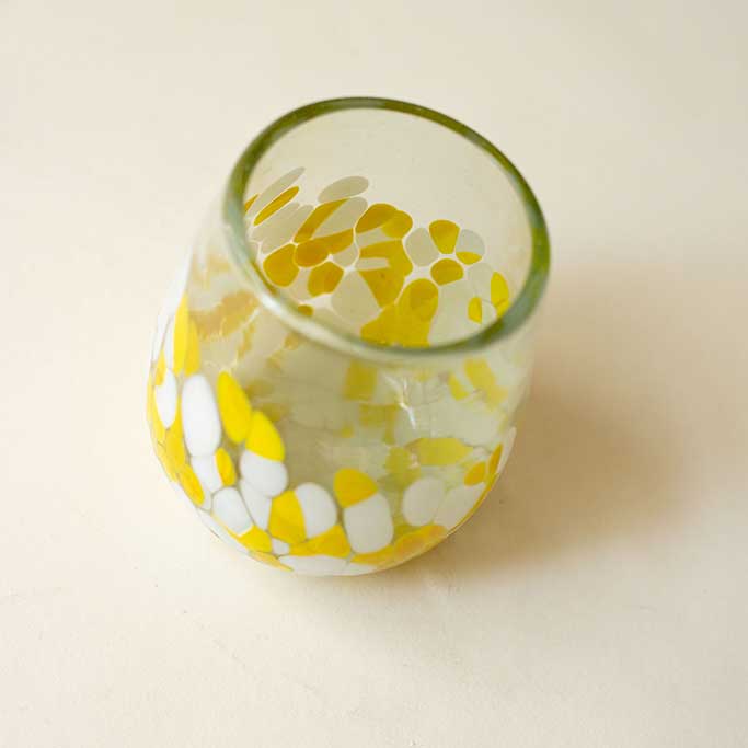 A handcrafted large round tumbler featuring a vibrant yellow and white speckled finish. Each piece is individually made, resulting in subtle variations that highlight its artisanal character. Its generous size and rounded form offer a comfortable grip, making it ideal for serving a variety of beverages with a bold and expressive touch.