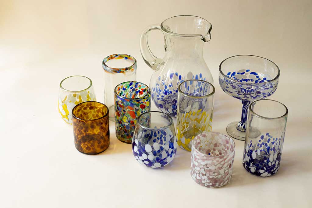 Hand-blown glass using the 'pintas' (speckled) technique. Vibrant pieces with contemporary designs created in collaboration with artisanal workshops from Jalisco.