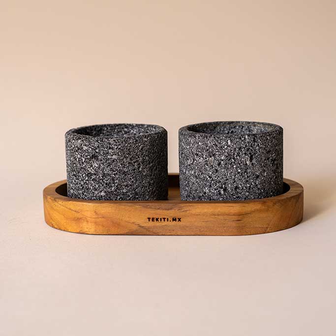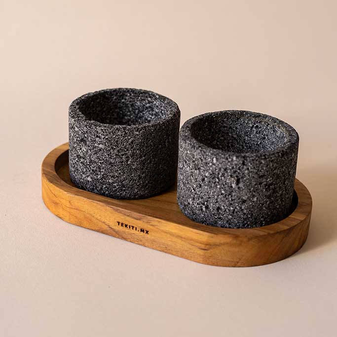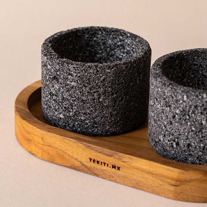 Set de dos salseros de piedra de basalto con base de madera de granadillo. Ideales para colocar las salsas de tu elección y compartir con tus comenzales.